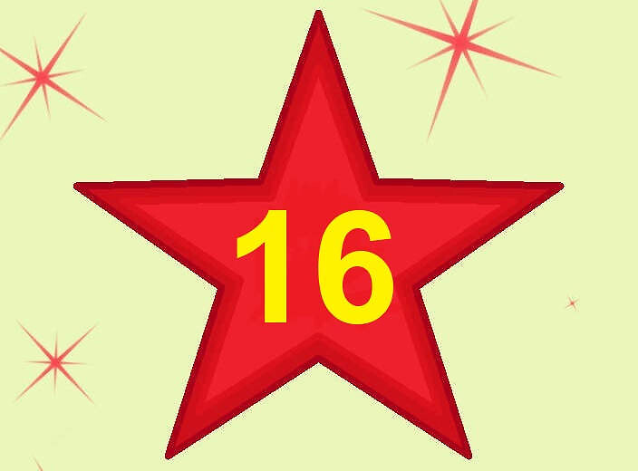 Ein roter großer Stern auf grünem Hintergrund mit der Aufschrift "16". Um den Stern sind mehrere kleine rote Sterne.