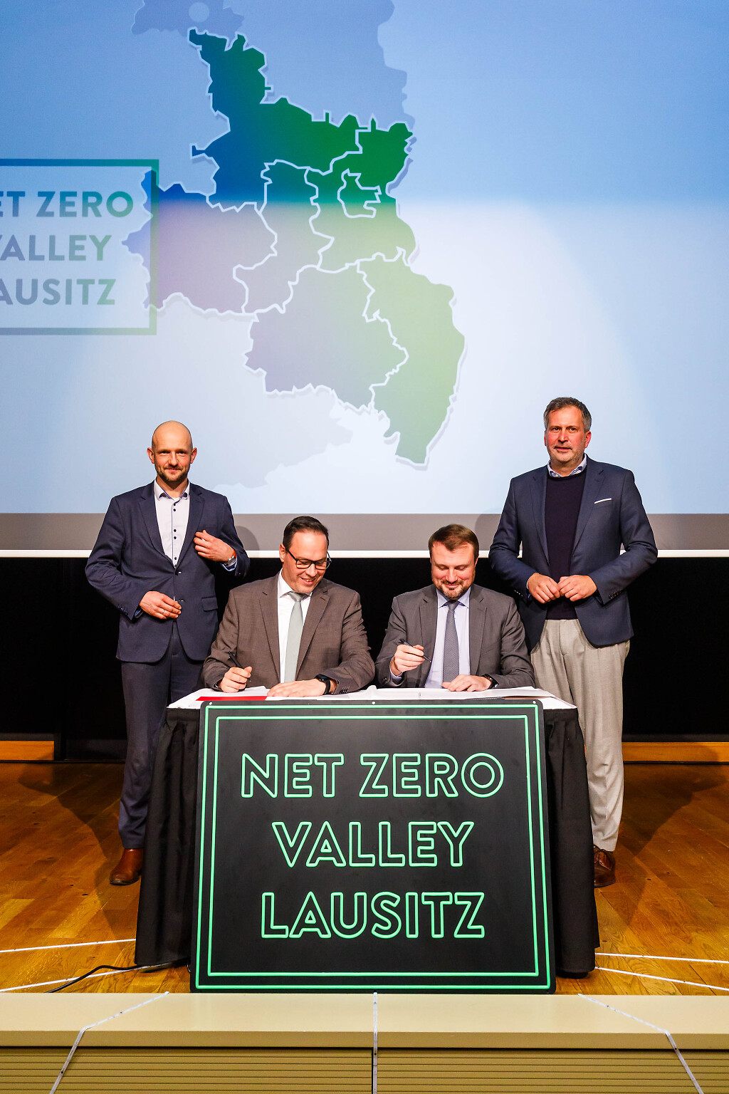 Zwei Männer im Anzug sitzen an einem Tisch, vor dem ein Schild mit grüner Aufschrift (Net Zero Valley Lausitz) steht, hinter ihnen stehen zwei weitere Männer im Anzug. Auf einer Leinwand dahinter ist ein Stück einer Landkarte zu sehen.