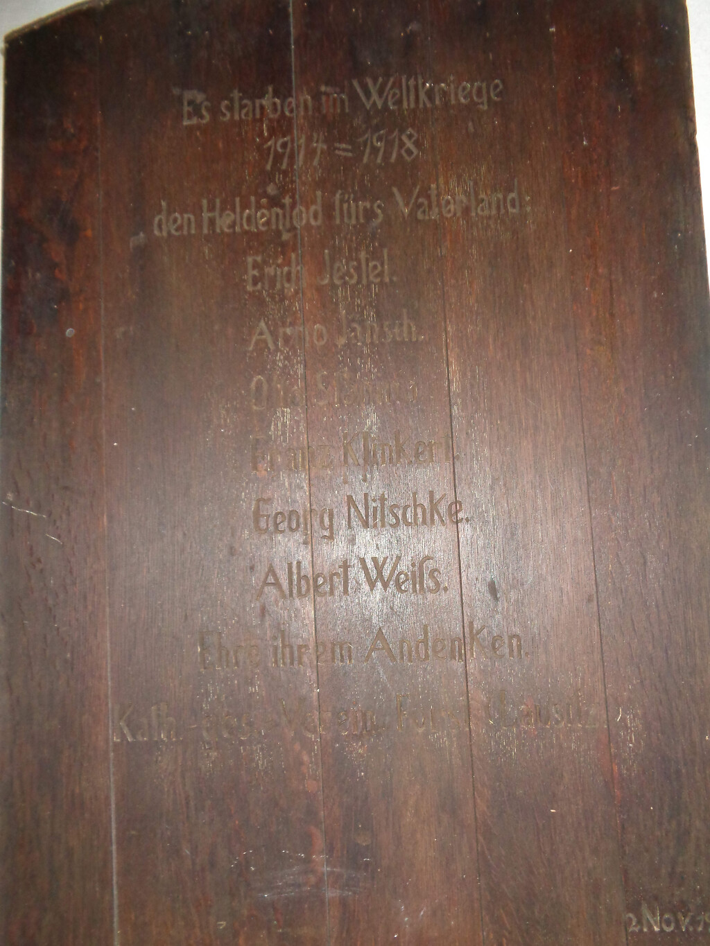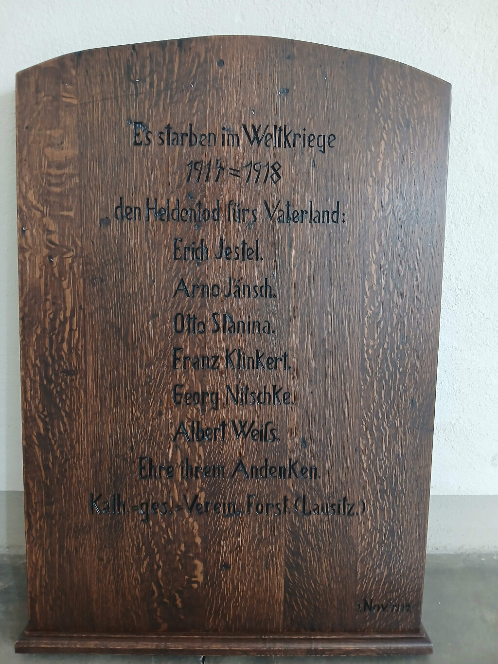 an ihrem neuen Platz gesegnet werden. Die sechs Namen, wahrscheinlich junger Männer, die ihr Leben im Krieg gelassen haben, stehen stellvertretend für die vielen Gefallenen der Weltkriege, derer wir in dem Gottesdienst gedenken wollen. Es sind Mitglieder des katholisch-geselligen Vereins, wie ein Gemeindeglied anhand des Adressbuches der Stadt Forst von 2025 herausfand.
