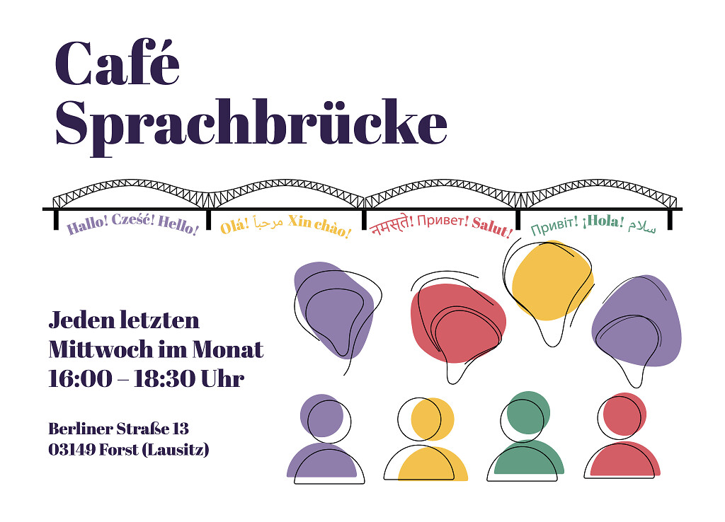 Das Café Sprachbrücke findet jeden letzten Mittwoch im Monat in der Zeit von 16:00 Uhr bis 18:30 Uhr in den Räumen der Jugendhilfe Cottbus gGmbH, Berliner Straße 13 in Forst (Lausitz) statt. Im Dezember findet das Café Sprachbrücke bereits am 2. Mittwoch (9. Dezember) statt.