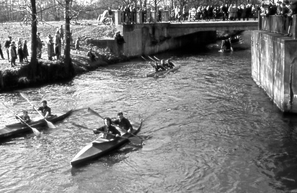 Schwarz-weiß Foto: Mehrere Kanus mit 2 oder 3 Personen fahren auf dem Mühlgraben. An den Seiten und auf einer Brücke im Hintergrund stehen Zuschauer.