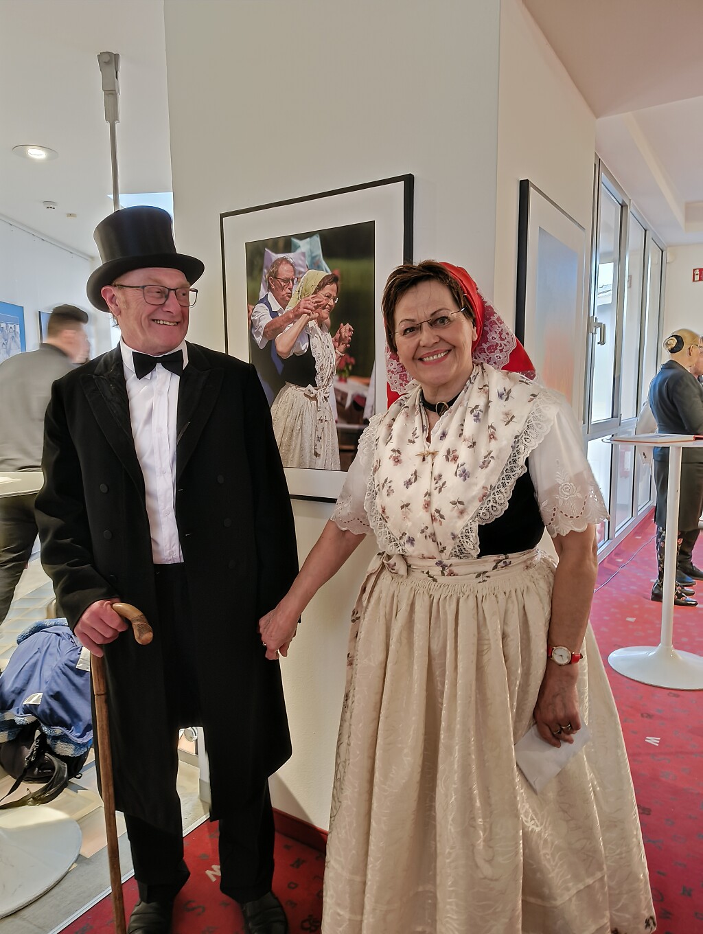Ein Mann in Frack und Zylinder hält eine Frau in traditioneller Tracht mit Kopftuch an der Hand in einem Ausstellungsraum mit roten Teppich und gerahmten Fotos an der Wand.
